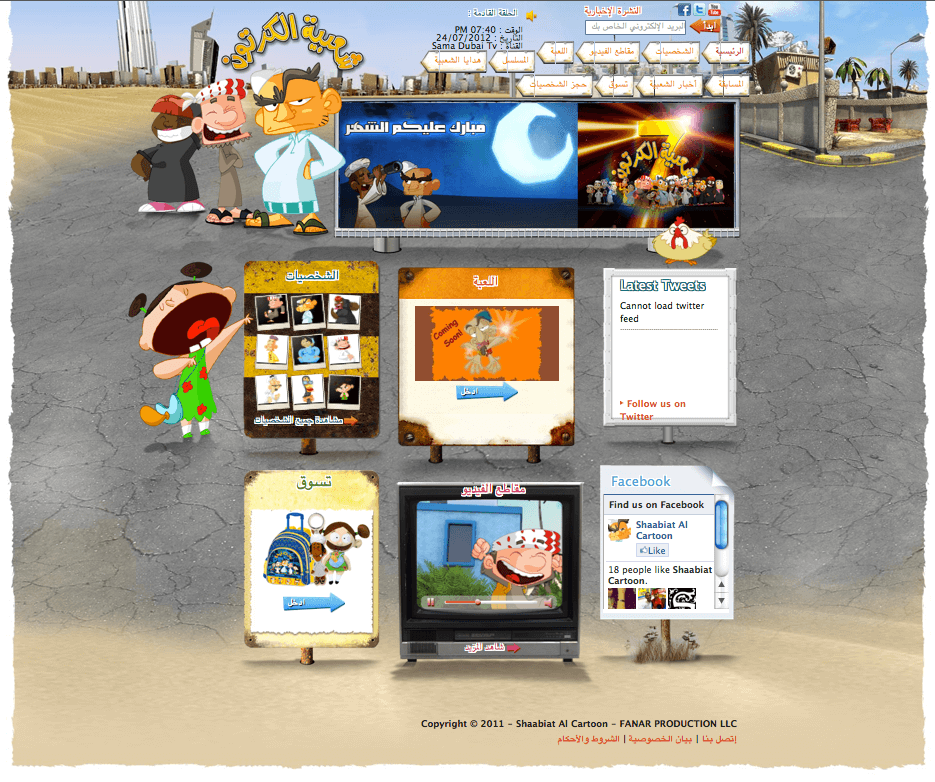 The bespoke website has been created to provide a central hub where the growing shaabiat Al Cartoon fan-base can congregate, allowing Fanar Production to establish a relationship with their audience and communicate with their fans. The website showcases the stars of the show, with pictures and information about each character and offers visitor’s exclusive content such as downloads, newsletters and competitions. Fans that become part of the online community will be treated to exciting new content on a regular basis and can look forward to the release of a fun, engaging game later in the year. The site will also provide a focal point for social media around the brand, profiling the latest tweets from the shaabiat Al Cartoon Twitter account and sharing their latest Facebook updates, friends and number of likes.
