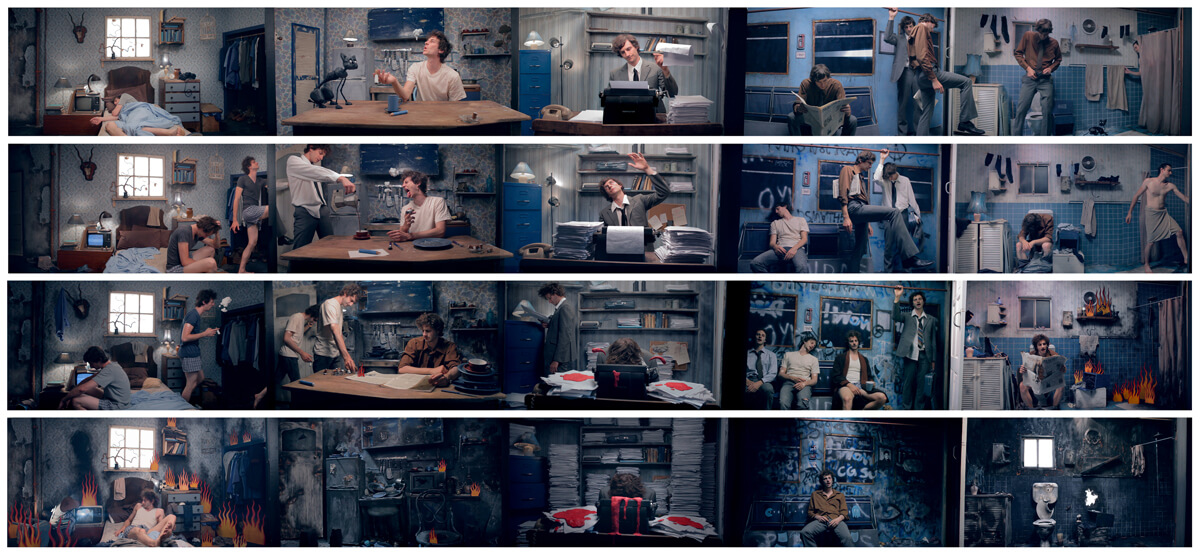 That report is entirely true- it was like a non painful form of childbirth. There were so many times where we were literally working on the individual elements for 24 hours straight, surviving purely on the belief of the end goal. Not even including the compositing time. The set alone, was a small house. We had lunch in it, we had naps on the bed and our actual studio fridge was painted grey and put in place. We had to build the various rooms. We furnished them according to colour palette. We found the toilet in the branches of a friends tree. We completely tiled the bathroom ourselves without knowing how. We bought over 10,000 sheets of paper for the office. And after all of that, we burnt it all with a flamethrower for the final camera pass. We’d never even made a large scale set before- so it was an almighty learning curve for us…