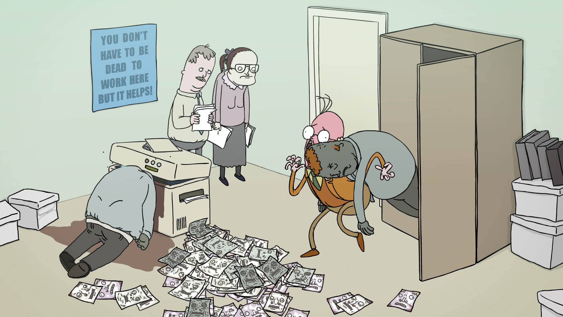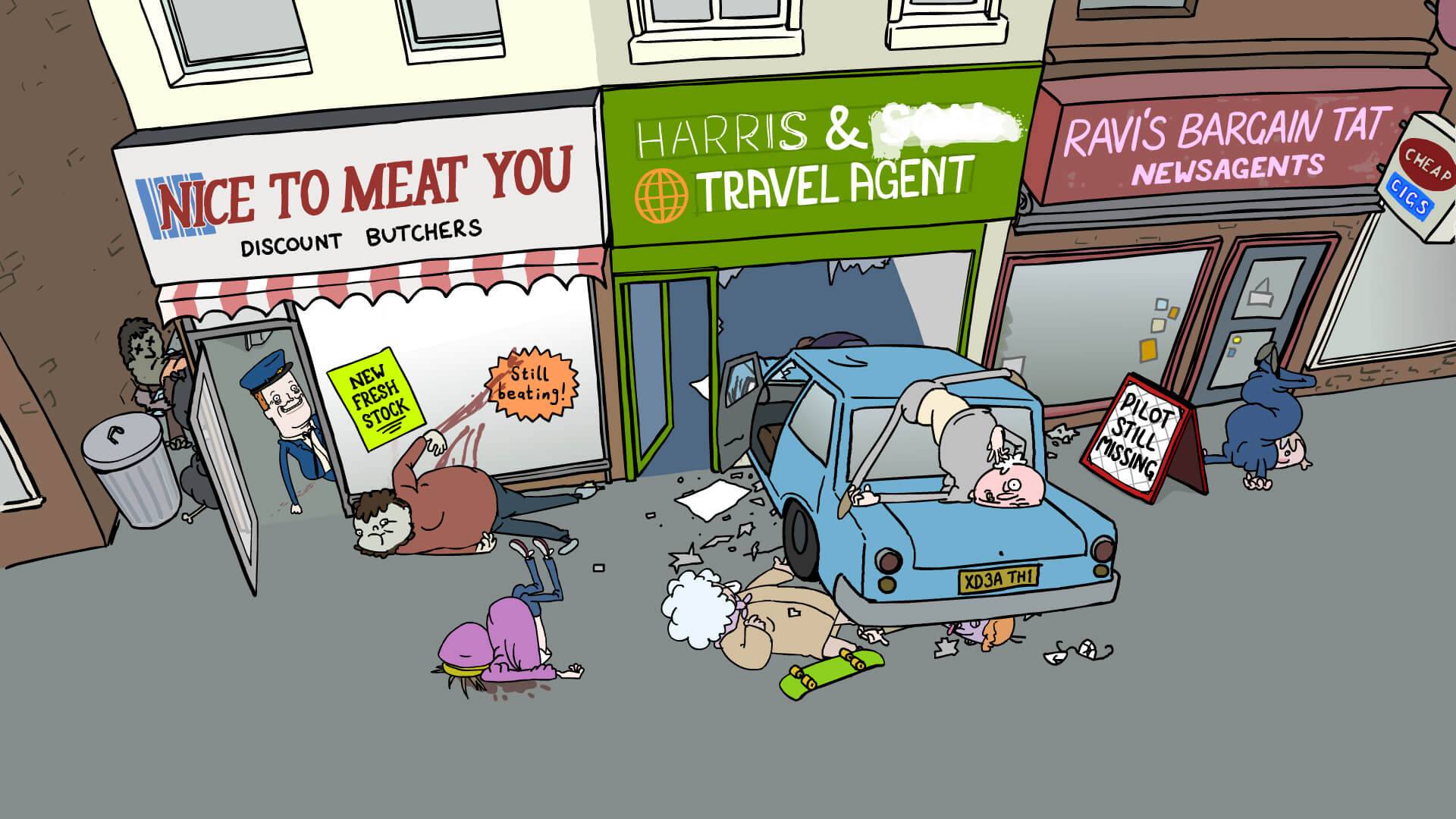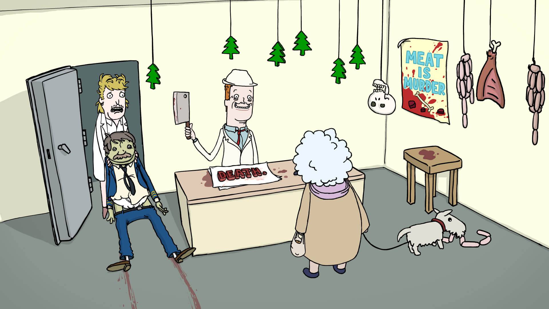 The core of the idea really was to take something serious and morbid and give it a big positive spin with a thick layer of irony. Also, dead bodies in normal situations is a funny idea.