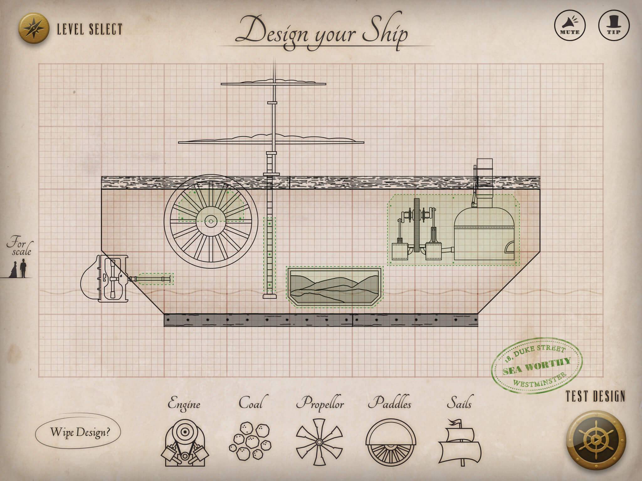 The game takes the player through a series of ship building challenges, based on those that Brunel faced throughout his career. Successfully completing the challenges earns the player more money and stars so they can buy extra parts (engines, propellers, sails, coal and paddles); eventually resulting in the ‘ultimate ship’ that can cut through rough seas, carry more cargo, go the furthest distance and destroy opponents in tug-of-war battles.