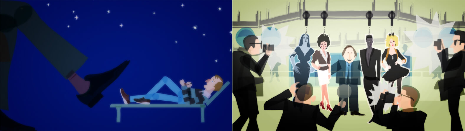 “A Liar’s Autobiography” is an animated feature films that was produced across a number of Animation Studios in the UK and the US. My chapter of the film features Graham Chapman past the peak of his career, living in the luxurious tax haven of LA in the 80s. He surrounds himself with a mind-numbing amount of celebrities and is suffering from a rare name-dropping addiction. The film is my first stereoscopic project. I tried to create the look of illuminated acetate on a multiplane lightbox with digital tools, so everything is super-imposed. This seemed the right fit for graham’s hazey sense of reality in the candy-coloured world of super- stardom.