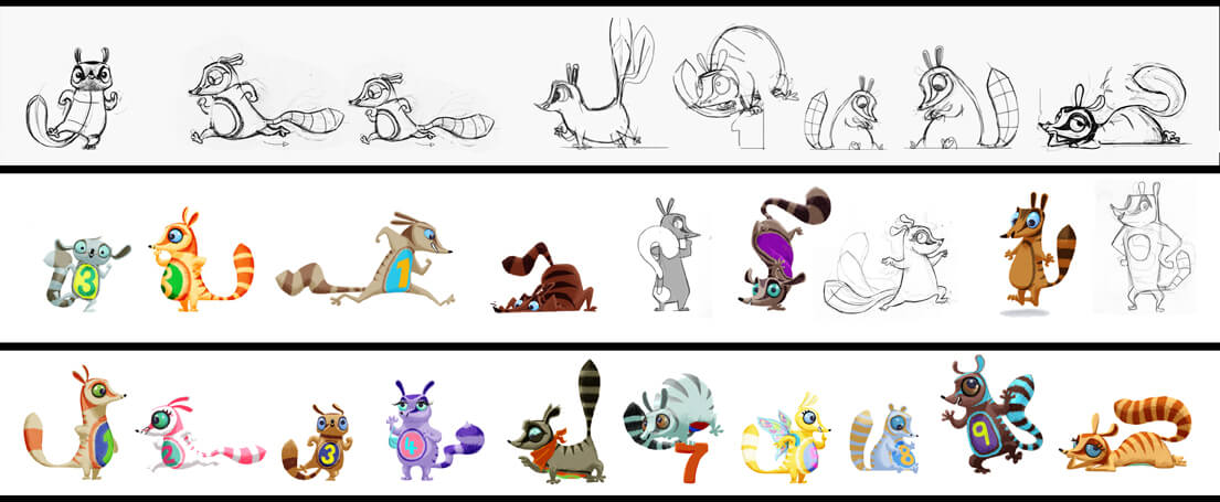 The process of designing a show for children is a very different one from working on my own short films, most of all because it is a collaborative process and you have to put yourself in the mindset of a very young audience. Many designs were passed along between myself Steve and CBeebies. I created the initial repertoire of visual styles, expressions and poses and then these were matched with personalities that evolved in the script-writing. The intention was to put together a set of personalities that is strong and diverse enough to populate longer stories in the numtum universe further down the line, as well as pursuing their main tasks – counting objects and having a lot of number parties.