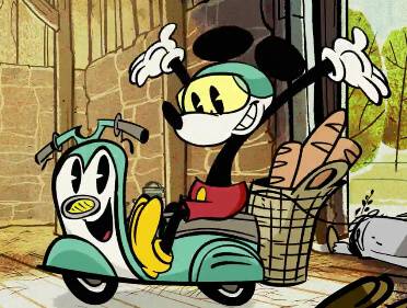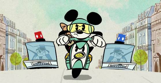 The short takes on a fresh-yet-familiar style, with the character designs harkening back to days gone by, but with the clean lines and limited animation that made shows like Powerpuff Girls and Dexter’s Lab so popular. The anthropomorphic nature of Mickey’s scooter remind any animator who has poured over old Disney films of the rubber-hose days when toasters and violins sprang to life complete with faces and expressions.