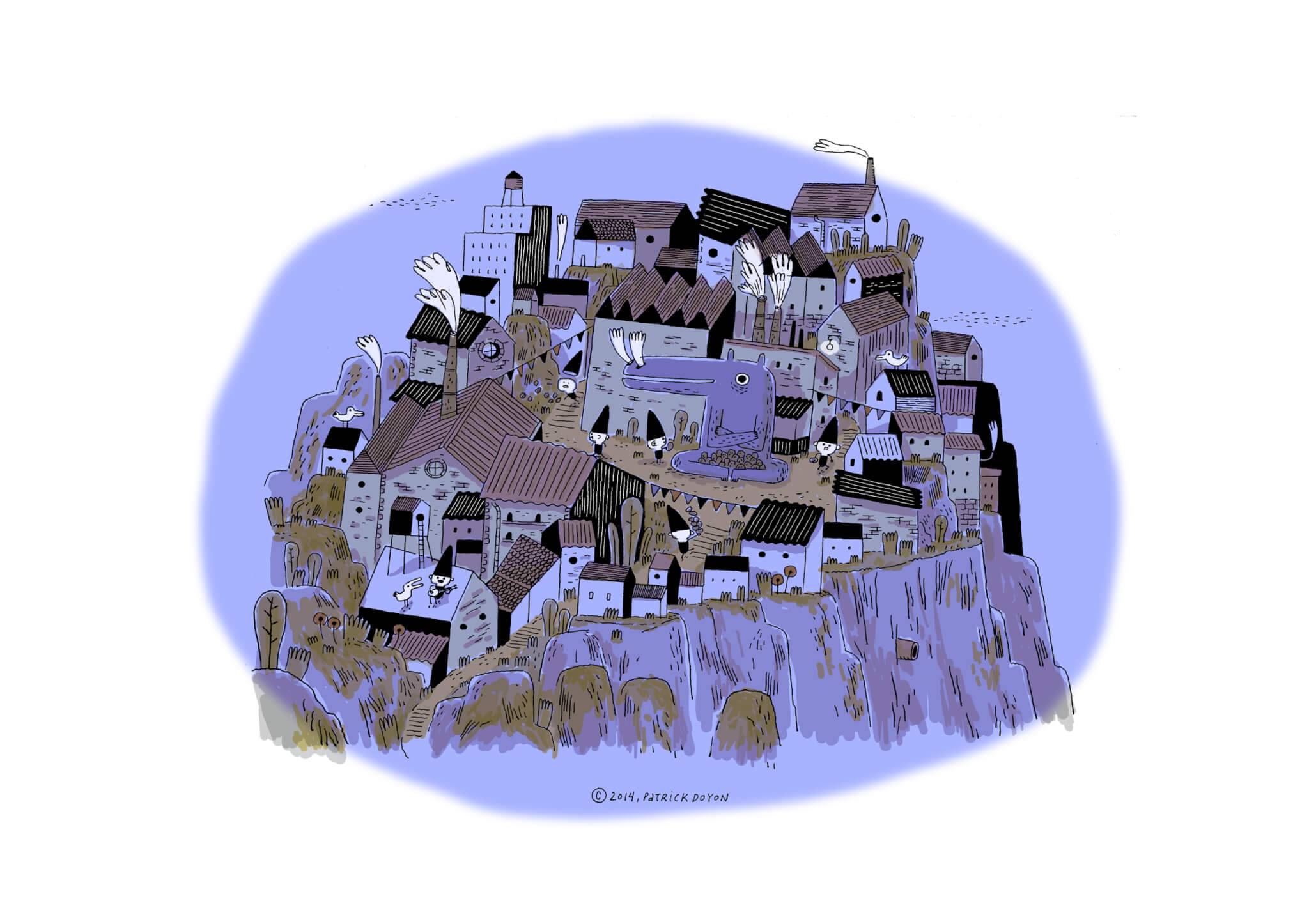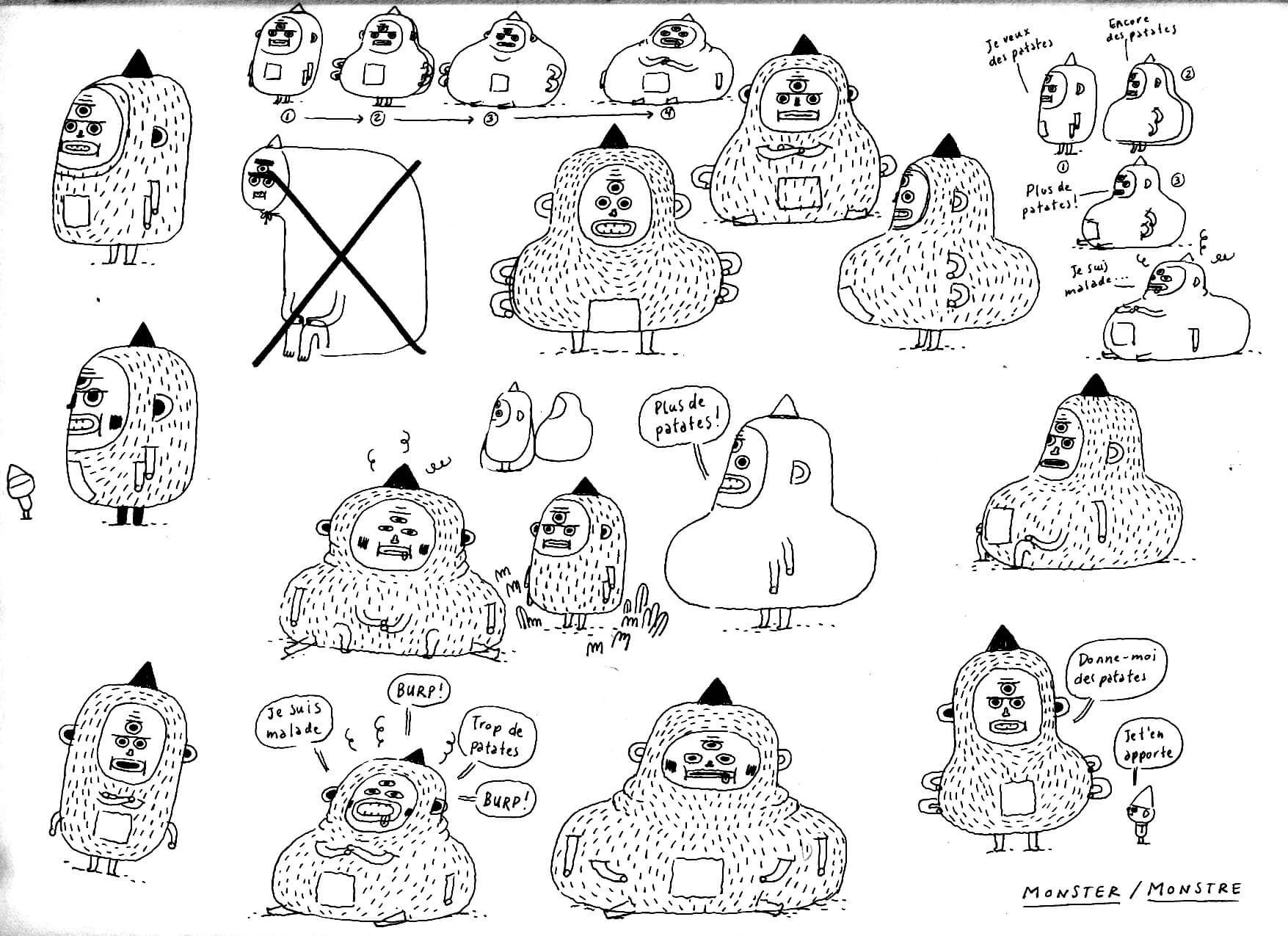 When we got Patrick’s illustrations, the feelings and characters were there. Patrick had understood intuitively that his drawings were to become gameplay, they were going to serve as mechanisms. For example, he immediately suggested that the little character have a pointed hat that could be used as both a potato basket and a megaphone. Patrick saw right away that the character was not just a little guy, but that he had functions. And in the village he presented to us there were doors and passages. He had already understood the principle of the game. Patrick worked two months full-time. His mandate was to give shape to the characters and the world in which they live. Plus adding some props: the potato tree, the peelings, everything that gets handled in the game. He was the one who gave a soul to the monster-factory that can be associated with capitalism, the game’s main metaphor. The artistic director at Minority, Sophie Paquette, did an extraordinary job to bring it all to 3D life.