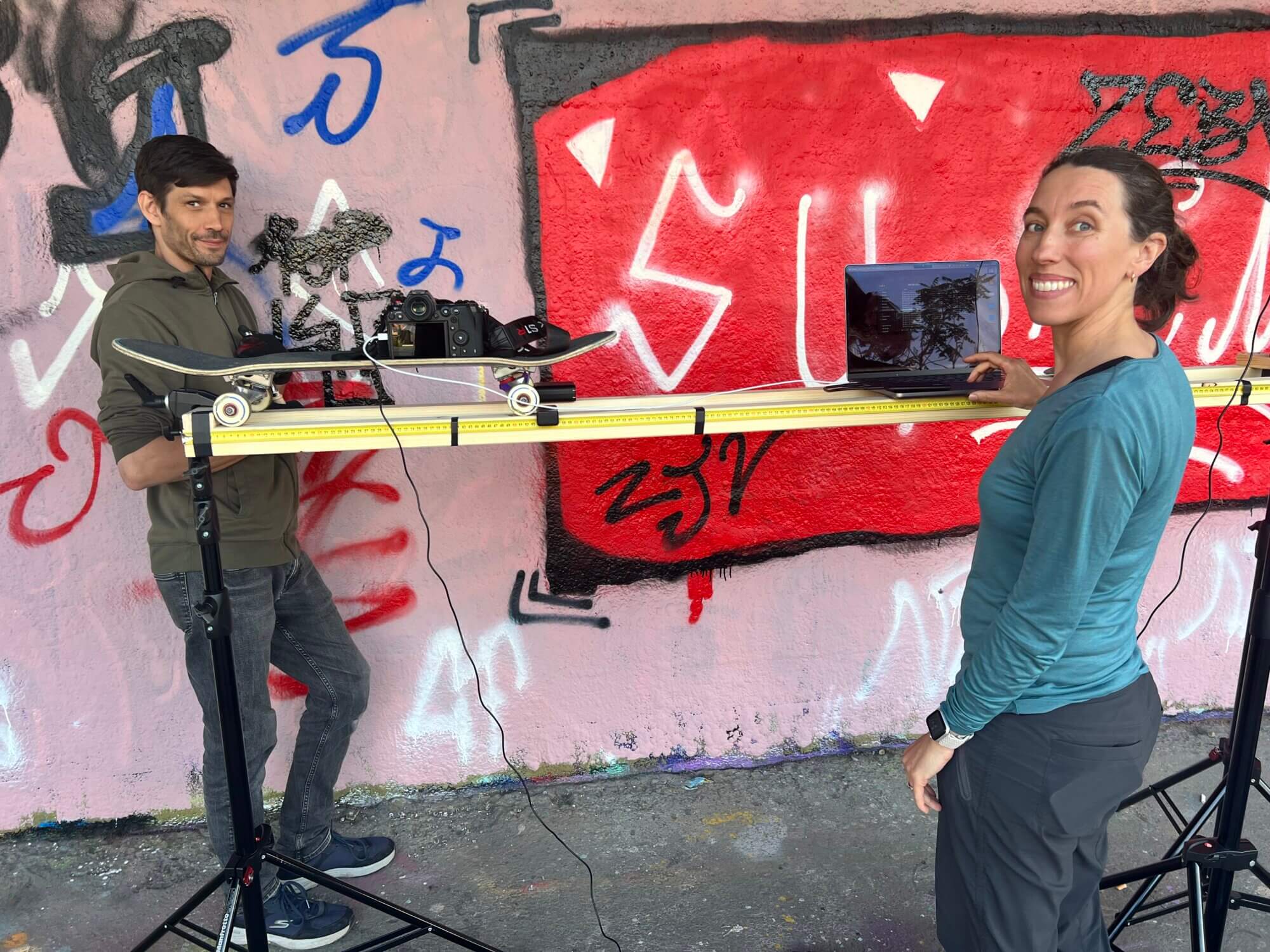 The film was shot entirely on location at a legal graffiti wall in the center of Vienna through a variety of DIY animation techniques, including a skateboard dolly shot and portable strobe lights. Technical director and animator Thom Parks worked alongside Nuderscher and Parks to make carvings on the walls that were incrementally changed and captured frame-by-frame. The artists dubbed themselves “skrffologists” during the process: