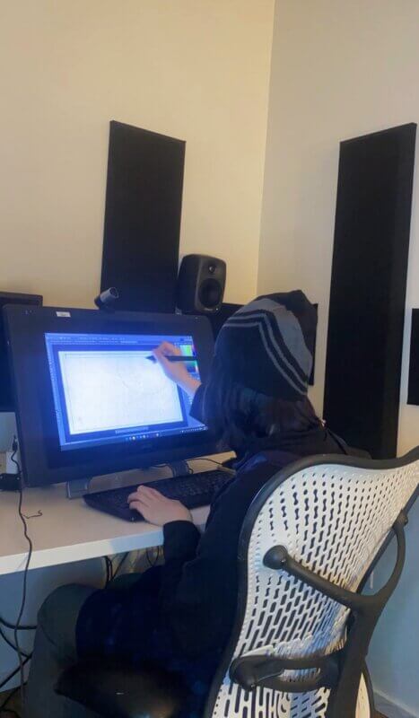 This film is a digital 2D animation with characters created primarily using rotoscoping. I filmed live actors performing the scenes and then traced over the footage to capture realistic movement. These animated characters were then composited into hand-drawn backgrounds. I chose rotoscoping to complement the film’s realistic style, as the story explores relevant social themes grounded in real-life settings.