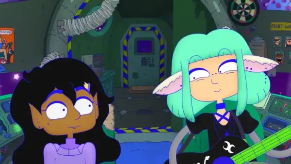 The vibrant and often bubblegum palette incorporated throughout the 2D animation wonderfully brings the numerous planets, characters and gloom goo of this off-the-wall universe to life. While the animation is particularly reminiscent of Rick and Morty, Adventure Time and other Cartoon Network offerings, there’s an added unpolished scrappy charm to it. Eagle eyed viewers will also be treated to entertaining little details peppered throughout, including the amusing DVD titled “Raiders of the Lost Dyke” and Saira’s “live, laugh, lesbian” banner.