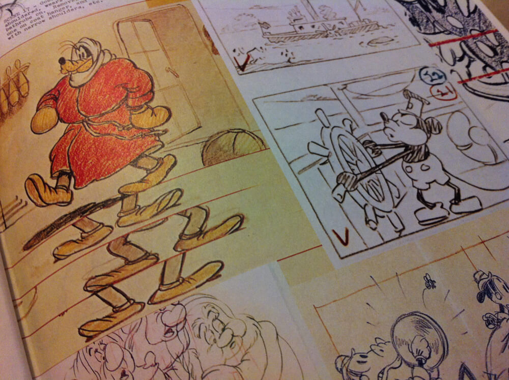 Anyone with more than a passing affection for Walt Disney won’t be surprised to learn that this book is not filled with his own sketches. Walt Disney after all was a businessman with a keen eye for talented artists, and it is generally the work of those artists that fills this book, from storyboard panels and model sheets right the way through to layout drawings and posters, the author has taken care in selecting the right images to guide us through the story of the Walt Disney empire. It is nice to see behind the scenes photographs of the multiplane cameras or promo images of the early studio employees joining Carl Stalling gathered around a piano in song. We not only see images from the animation process but also images from Disney’s movie and theme park creations dreamed up by the Imagineers.