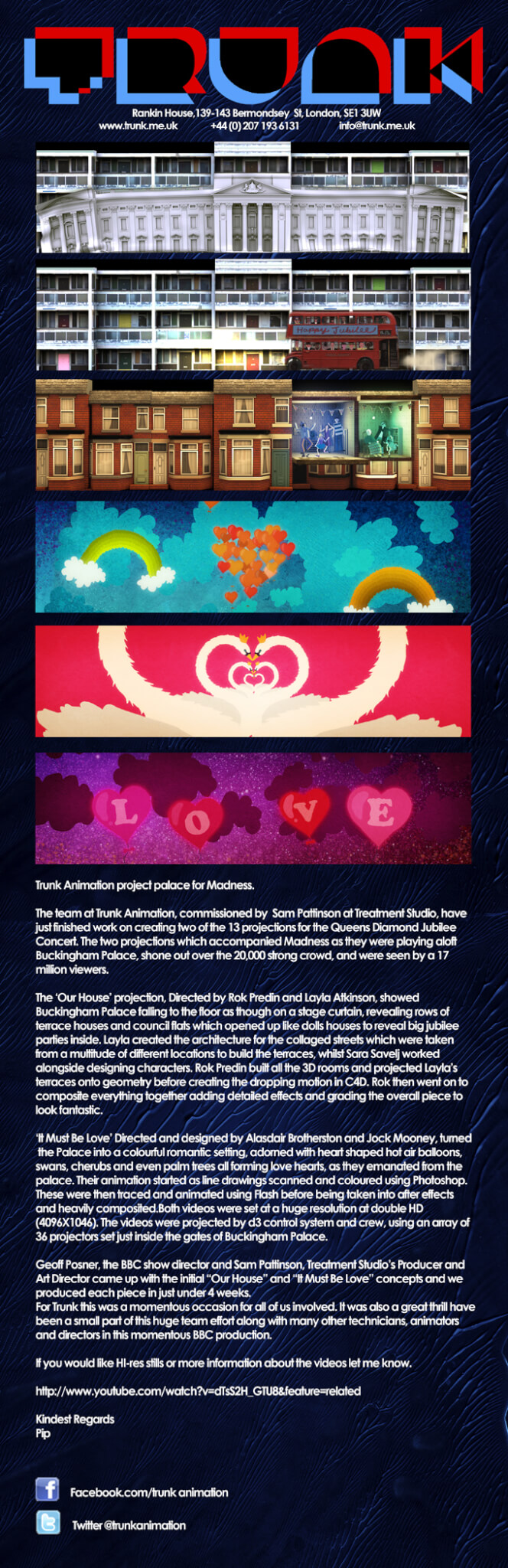 The team at Trunk Animation, commissioned by Sam Pattinson at Treatment Studio, have just finished work on creating two of the 13 projections for the Queens Diamond Jubilee Concert. The two projections which accompanied Madness as they were playing aloft Buckingham Palace, shone out over the 20,000 strong crowd, and were seen by a 17 million viewers.